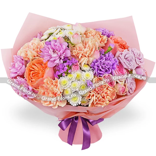 Стандартный: роза персиковая - 2 шт.,гвоздика персиковая - 5 шт., гвоздика фиолетовая - 2 шт., роза кустовая розовая - 2 шт., роза кустовая фиолетовая - 2 шт., хризантема кустовая ромашковая фиолетовая - 2 шт., хризантема сантини - 2 шт., статица, упаковка, лента. Примерный размер: 35Х35 см.